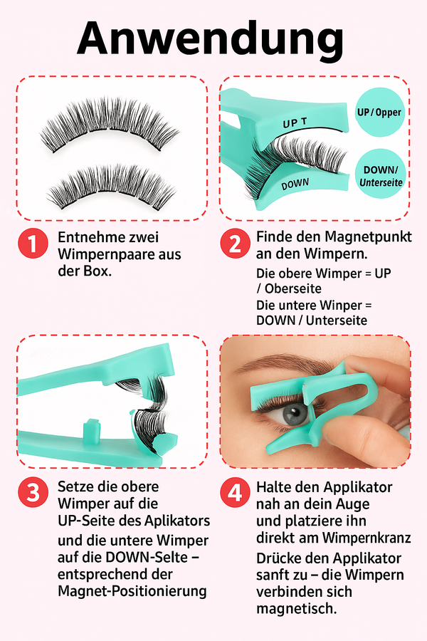 Setzen Sie die Wimpern einfach auf den Magnetstreifen des Curlers und platzieren Sie sie nahe der natürlichen Wimpernlinie. Kein Kleber erforderlich!